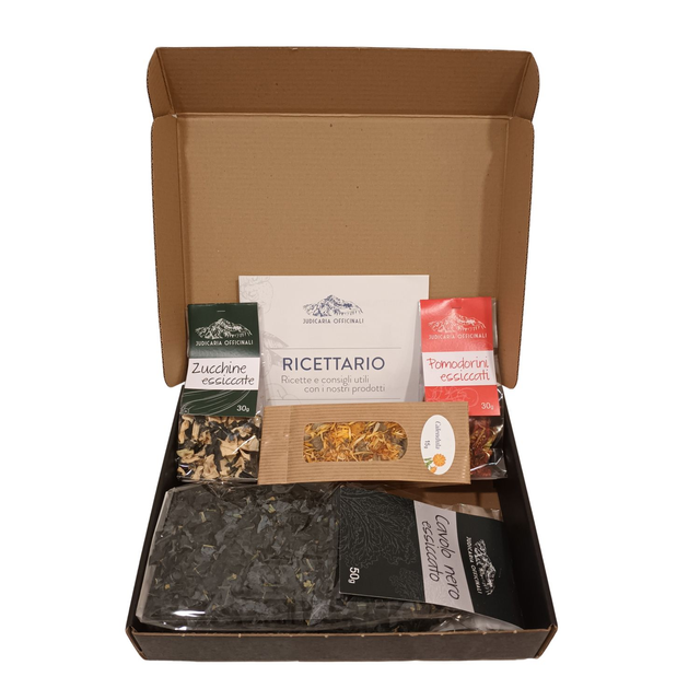 Confezione deluxe in scatola nera con ortaggi essiccati: zucchine, pomodorini, cavolo nero, calendula con ricettario.